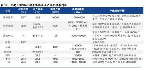 組件端龍頭引領(lǐng),TOPCon進(jìn)入規(guī)?;慨a(chǎn)元年,溢價(jià)下經(jīng)濟(jì)性初現(xiàn),國海證券列舉了各大龍頭布局情況: