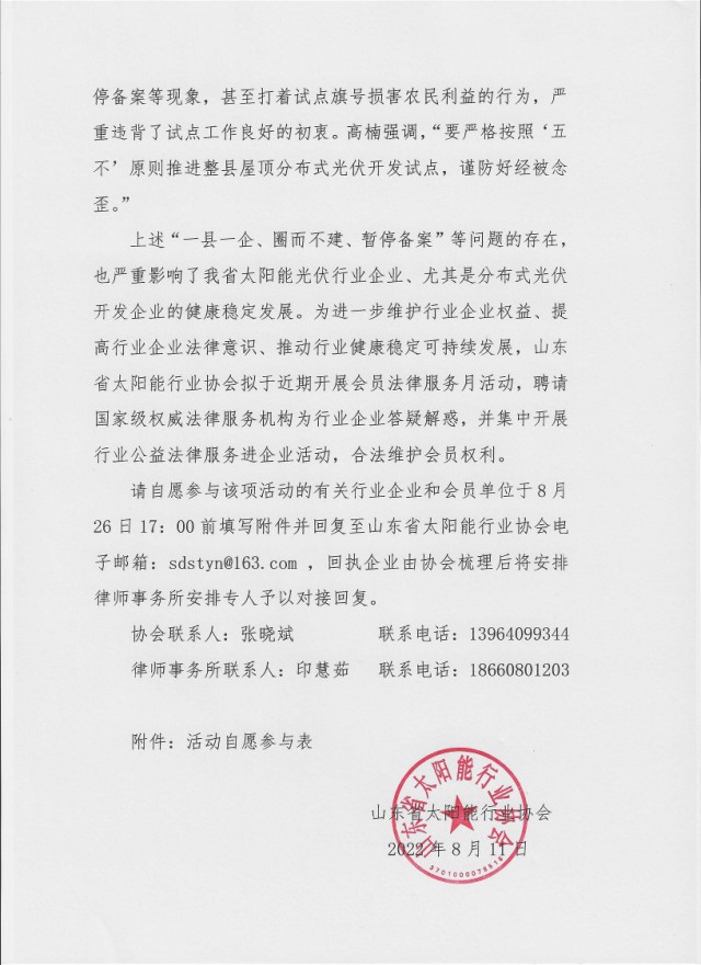請自愿參與該項活動的有關(guān)行業(yè)企業(yè)和會員單位于8月26日17:00 前填寫附件并回復(fù)至山東省太陽能行業(yè)協(xié)會電子郵箱:sdstyn@163.com,回執(zhí)企業(yè)由協(xié)會梳理后將安排律師事務(wù)所安排專人予以對接回復(fù)。