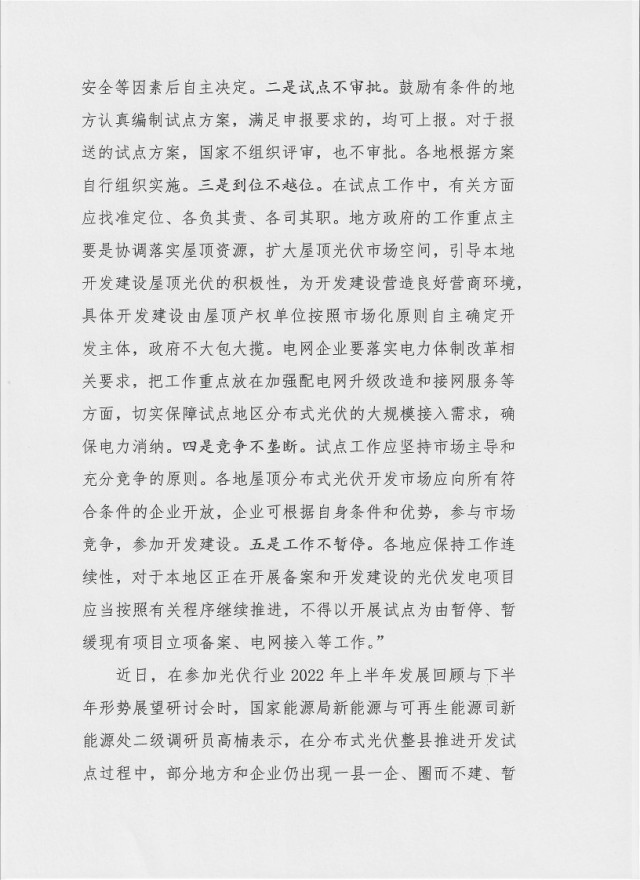 啟動整縣(市、區(qū))推進(jìn)屋頂分布式光伏開發(fā)試點工作,主要目的就是充分調(diào)動和發(fā)揮地方積極性,引導(dǎo)地方政府協(xié)調(diào)更多屋頂資源,進(jìn)一步開拓市場,擴(kuò)大屋頂分布式光伏的建設(shè)規(guī)模。去年,國家能源局提出“在開展整縣(市、區(qū))推進(jìn)屋頂分布式光伏開發(fā)試點工作中需要著重把握以下五個方面:一是自愿不強(qiáng)制。各地是否開展試點以及開展多少個試點由各地根據(jù)自身實際情況自己決定,不搞行政命令。建筑屋頂是否開展建設(shè),由屋頂產(chǎn)權(quán)單位綜合考慮屋頂承重、安全等因素后自主決定。二是試點不審批。鼓勵有條件的地方認(rèn)真編制試點方案,滿足申報要求的,均可上報。對于報送的試點方案,國家不組織評審,也不審批。各地根據(jù)方案自行組織實施。三是到位不越位。在試點工作中,有關(guān)方面應(yīng)找準(zhǔn)定位、各負(fù)其責(zé)、各司其職。地方政府的工作重點主要是協(xié)調(diào)落實屋頂資源,擴(kuò)大屋頂光伏市場空間,引導(dǎo)本地開發(fā)建設(shè)屋頂光伏的積極性,為開發(fā)建設(shè)營造良好營商環(huán)境,具體開發(fā)建設(shè)由屋頂產(chǎn)權(quán)單位按照市場化原則自主確定開發(fā)主體,政府不大包大攬。電網(wǎng)企業(yè)要落實電力體制改革相關(guān)要求,把工作重點放在加強(qiáng)配電網(wǎng)升級改造和接網(wǎng)服務(wù)等方面,切實保障試點地區(qū)分布式光伏的大規(guī)模接入需求,確保電力消納。四是競爭不壟斷。試點工作應(yīng)堅持市場主導(dǎo)和充分競爭的原則。各地屋頂分布式光伏開發(fā)市場應(yīng)向所有符合條件的企業(yè)開放,企業(yè)可根據(jù)自身條件和優(yōu)勢,參與市場競爭,參加開發(fā)建設(shè)。五是工作不暫停。各地應(yīng)保持工作連續(xù)性,對于本地區(qū)正在開展備案和開發(fā)建設(shè)的光伏發(fā)電項目應(yīng)當(dāng)按照有關(guān)程序繼續(xù)推進(jìn),不得以開展試點為由暫停、暫緩現(xiàn)有項目立項備案、電網(wǎng)接入等工作。”