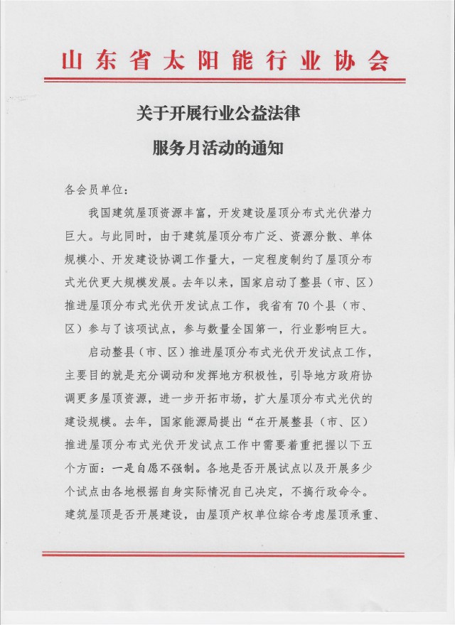 上述“一縣一企、圈而不建、暫停備案”等問題的存在,也嚴(yán)重影響了我省太陽能光伏行業(yè)企業(yè)、尤其是分布式光伏開發(fā)企業(yè)的健康穩(wěn)定發(fā)展。為進(jìn)一步維護(hù)行業(yè)企業(yè)權(quán)益、提高行業(yè)企業(yè)法律意識、推動行業(yè)健康穩(wěn)定可持續(xù)發(fā)展,山東省太陽能行業(yè)協(xié)會擬于近期開展會員法律服務(wù)月活動,聘請國家級權(quán)威法律服務(wù)機(jī)構(gòu)為行業(yè)企業(yè)答疑解惑,并集中開展行業(yè)公益法律服務(wù)進(jìn)企業(yè)活動,合法維護(hù)會員權(quán)利。