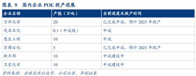 華創(chuàng)證券認(rèn)為,隨著后續(xù)國內(nèi)企業(yè)中試完成及投產(chǎn)進度的加快,我國POE廠商有望獲取廣闊的國產(chǎn)化空間。國盛證券也認(rèn)為,POE粒子國產(chǎn)化或是未來光伏行業(yè)內(nèi)兩到三年最清晰的產(chǎn)業(yè)趨勢之一,國產(chǎn)廠商有望實現(xiàn)POE粒子的國產(chǎn)化。
