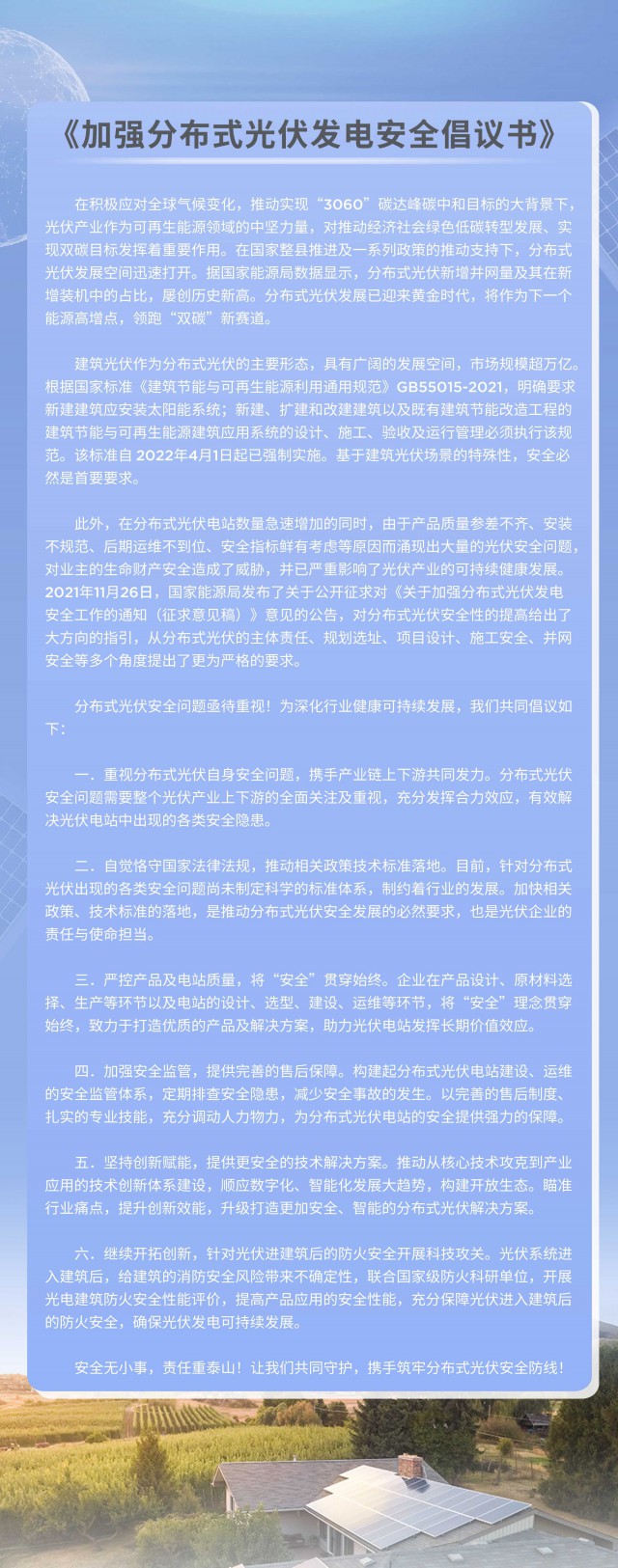 眾所周知,光伏項(xiàng)目安裝在建筑屋頂上,一旦發(fā)生起火等安全事故,后果十分嚴(yán)重。隨著《關(guān)于加強(qiáng)分布式光伏發(fā)電安全工作的通知(征求意見稿)》等政策推進(jìn)落實(shí),對(duì)電站安全、特別是電氣安全的重視明顯提升。索比光伏網(wǎng)了解到,《倡議書》發(fā)布后,得到了多位專家的高度評(píng)價(jià),預(yù)計(jì)后續(xù)將有更多企業(yè)、機(jī)構(gòu)響應(yīng)這一倡議,提高產(chǎn)品與系統(tǒng)安全性能,避免起火等安全事故,通過行業(yè)上下游協(xié)作、共筑分布式光伏安全防線,確保光伏產(chǎn)業(yè)健康可持續(xù)發(fā)展。