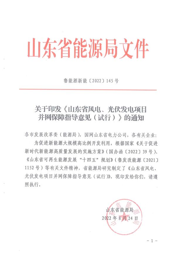為促進(jìn)新能源大規(guī)模高比例開發(fā)利用,根據(jù)國(guó)家《關(guān)于促進(jìn)新時(shí)代新能源高質(zhì)量發(fā)展的實(shí)施方案》(國(guó)辦函〔2022〕39號(hào))《山東省可再生能源發(fā)展“十四五”規(guī)劃》(魯發(fā)改能源〔2021〕1152號(hào))等有關(guān)文件精神,省能源局研究制定了《山東省風(fēng)電、光伏發(fā)電項(xiàng)目并網(wǎng)保障指導(dǎo)意見(試行)》,現(xiàn)印發(fā)給你們,請(qǐng)遵照?qǐng)?zhí)行。