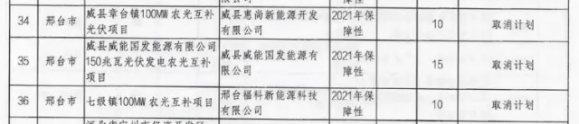根據(jù)文件來(lái)看,相比此前發(fā)布的《風(fēng)電、光伏發(fā)電項(xiàng)目擬調(diào)整情況公示》來(lái)看,光伏新增取消三個(gè)2021年光伏保障性項(xiàng)目指標(biāo),規(guī)??傆?jì)為350MW,風(fēng)電則未發(fā)生變化。需要注意的是,三個(gè)光伏項(xiàng)目均為農(nóng)光互補(bǔ)類(lèi)項(xiàng)目,其業(yè)主分別為惠尚新能源開(kāi)發(fā)、威縣威能?chē)?guó)發(fā)能源以及中國(guó)電建。