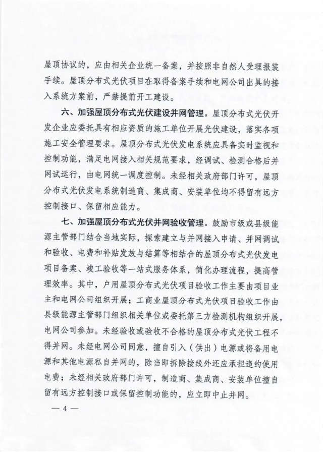工商業(yè)屋頂分布式光伏項(xiàng)目驗(yàn)收工作由縣級能源主管部門組織相關(guān)單位或委托第三方檢測機(jī)構(gòu)組織開展,電網(wǎng)公司參加。未經(jīng)驗(yàn)收或驗(yàn)收不合格的屋頂分布式光伏工程不得并網(wǎng)。未經(jīng)電網(wǎng)公司同意,擅自引入(供出)電源或?qū)溆秒娫春推渌娫此阶圆⒕W(wǎng)的,除當(dāng)即拆除接線外還應(yīng)承擔(dān)違約使用 電費(fèi);未經(jīng)相關(guān)政府部門許可,制造商、集成商、安裝單位擅自留有遠(yuǎn)方控制接口或保留控制功能的,應(yīng)立即中止并網(wǎng)。