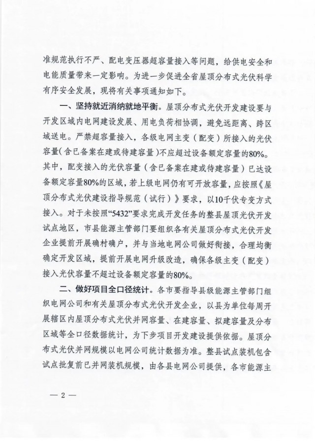 對于未按照“5432”要求完成開發(fā)任務(wù)的整縣屋頂光伏開發(fā)試點(diǎn)地區(qū),市縣能源主管部門要組織各有關(guān)屋頂分布式光伏開發(fā) 企業(yè)提前開展確村確戶,并與當(dāng)?shù)仉娋W(wǎng)公司做好銜接,合理均衡確定開發(fā)區(qū)域,提前開展電網(wǎng)升級改造,確保各級主變(配變)接入光伏容量不超過設(shè)備額定容量的80%。