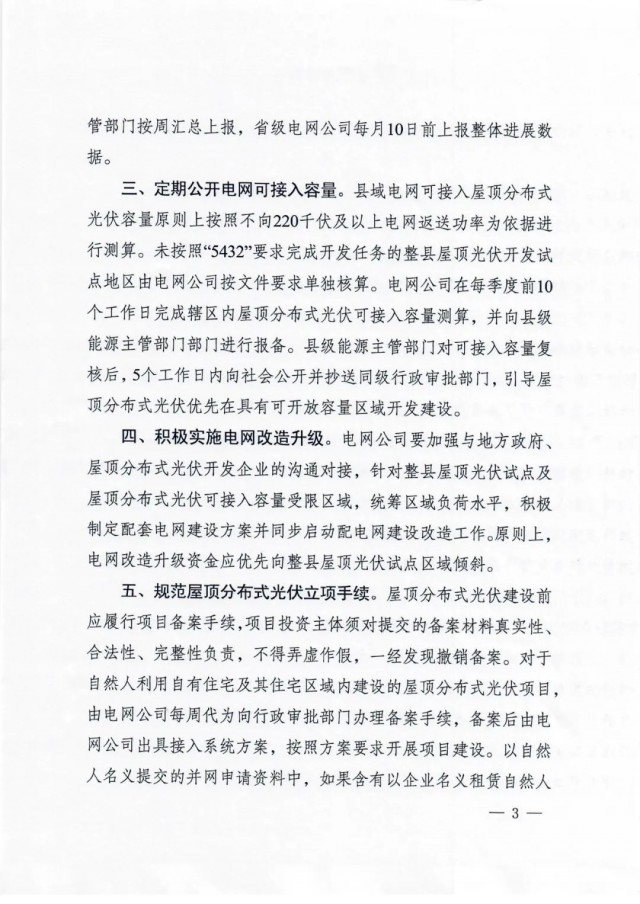 定期公開電網(wǎng)可接入容量??h域電網(wǎng)可接入屋頂分布式 光伏容量原則上按照不向220千伏及以上電網(wǎng)返送功率為依據(jù)進(jìn)行測算。未按照“5432”要求完成開發(fā)任務(wù)的整縣屋頂光伏開發(fā)試點(diǎn)地區(qū)由電網(wǎng)公司按文件要求單獨(dú)核算。