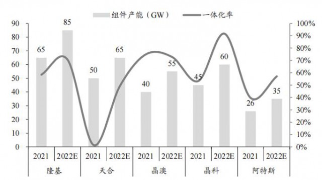 圖:組件龍頭組件產(chǎn)能及一體化率對(duì)比(GW,%),來(lái)源:CPIA,東吳證券研究所