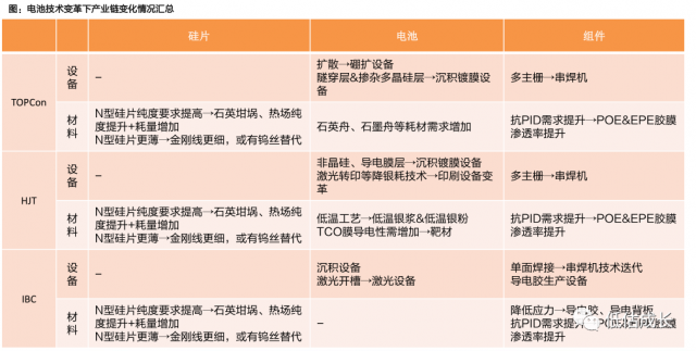 核心結(jié)論為:短期TOPCon與P型IBC具有優(yōu)勢(shì),中期TOPCon、HJT、IBC或?qū)⒐泊?,長(zhǎng)期預(yù)計(jì)將往TBC&HBC轉(zhuǎn)型;新技術(shù)變化下,較看好設(shè)備、電池組件、銀漿&銀粉。