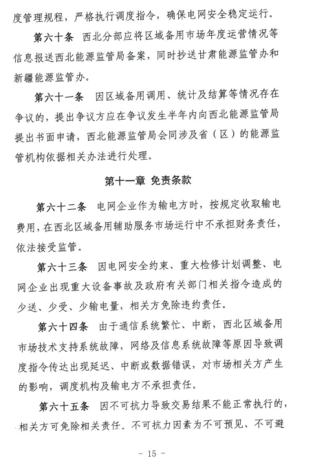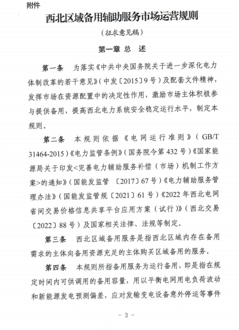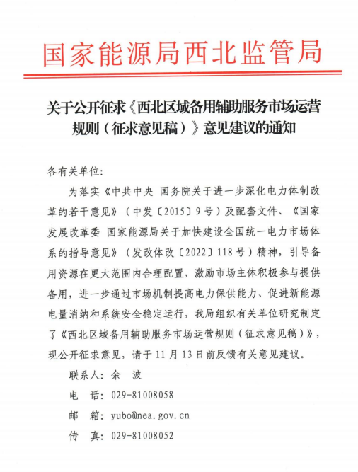 10月17日,西北能監(jiān)局公開征求《西北區(qū)域備用輔助服務(wù)市場運(yùn)營規(guī)則(征求意見稿)》意見建議的通知。