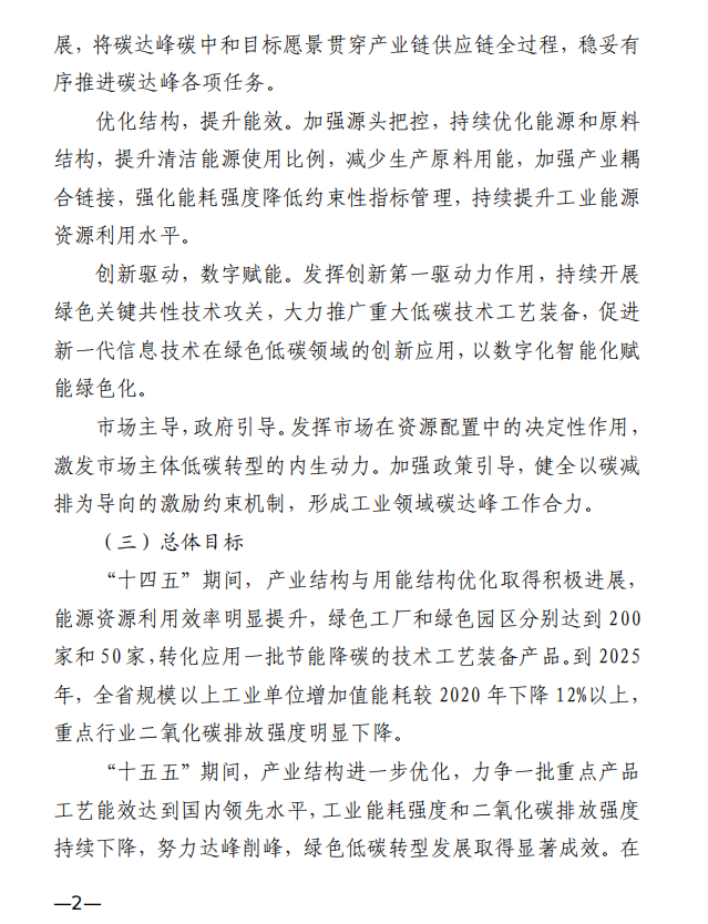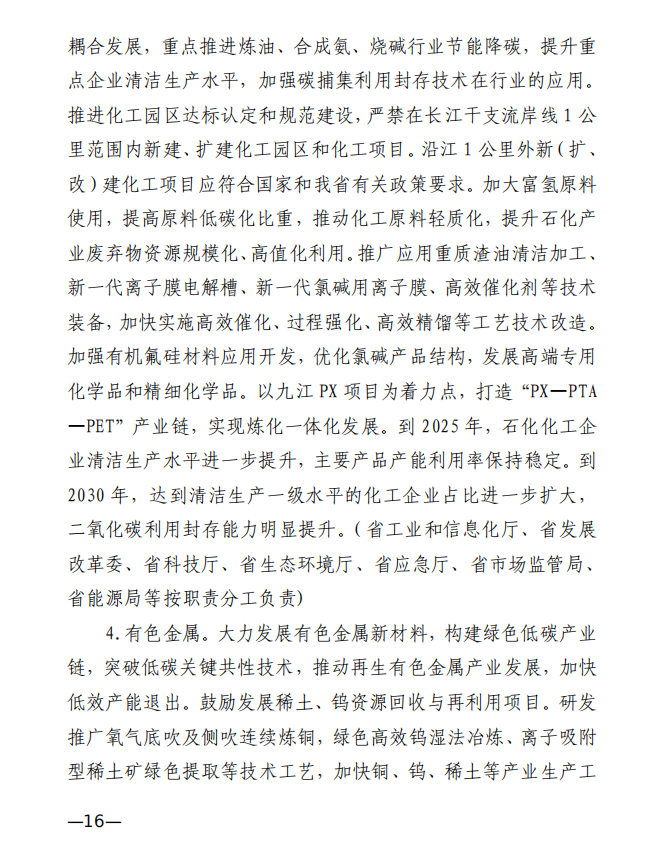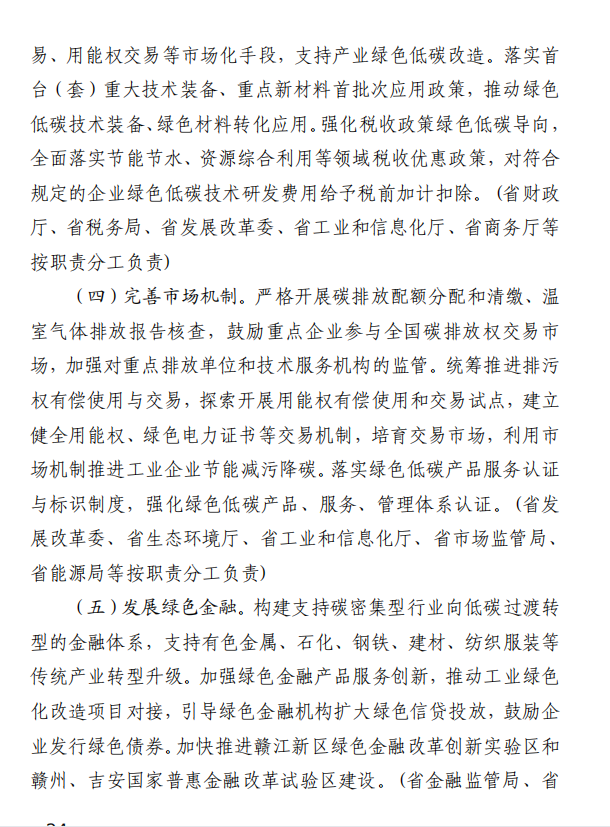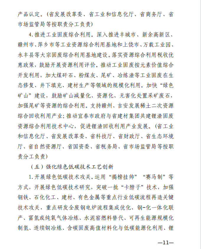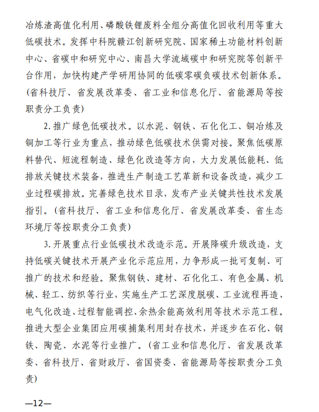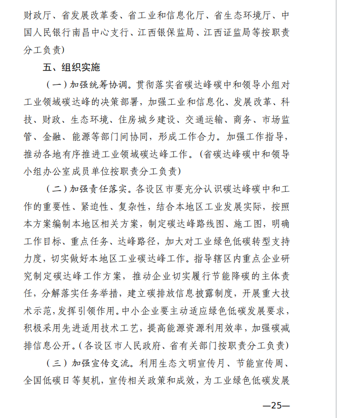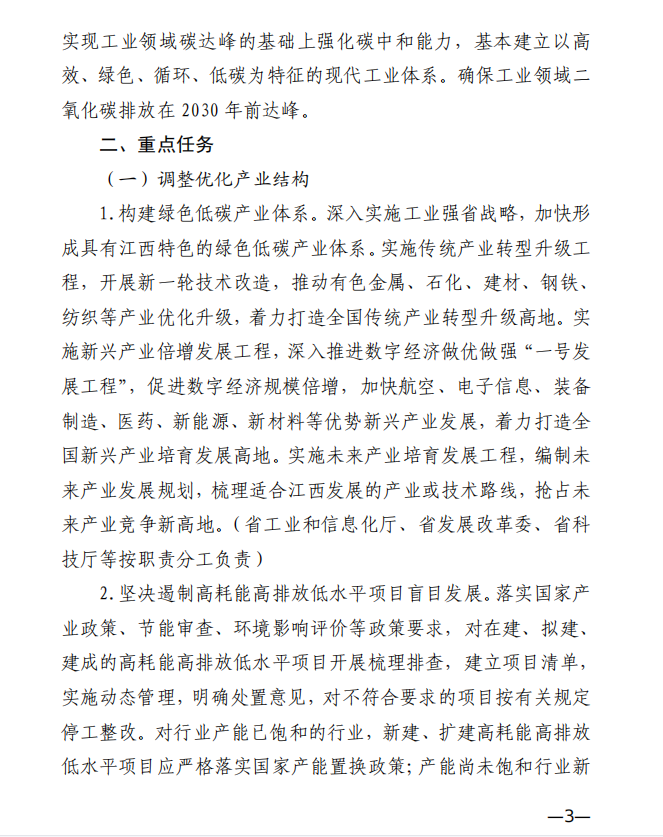 10月10日,江西省工業(yè)和信息化廳、江西省發(fā)展和改革委員會(huì)和江西省生態(tài)環(huán)境廳發(fā)布《關(guān)于印發(fā)江西省工業(yè)領(lǐng)域碳達(dá)峰實(shí)施方案的通知》,《江西省工業(yè)領(lǐng)域碳達(dá)峰實(shí)施方案》提出,“十四五”期間,江西力爭(zhēng)產(chǎn)業(yè)結(jié)構(gòu)與用能結(jié)構(gòu)優(yōu)化取得積極進(jìn)展,能源資源利用效率明顯提升,綠色工廠和綠色園區(qū)分別達(dá)到200家和50家;到2025年,全省規(guī)模以上工業(yè)單位增加值能耗較2020年下降12%以上。“十五五”期間,力爭(zhēng)一批重點(diǎn)產(chǎn)品工藝能效達(dá)到國(guó)內(nèi)領(lǐng)先水平,基本建立以高效、綠色、循環(huán)、低碳為特征的現(xiàn)代工業(yè)體系;確保工業(yè)領(lǐng)域二氧化碳排放在2030年前達(dá)峰。