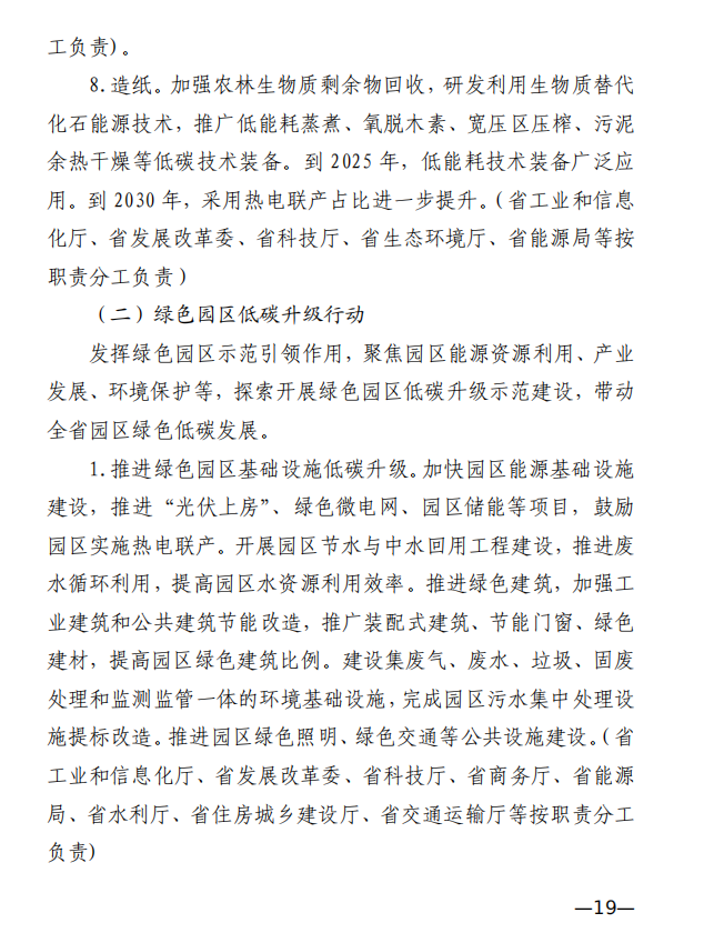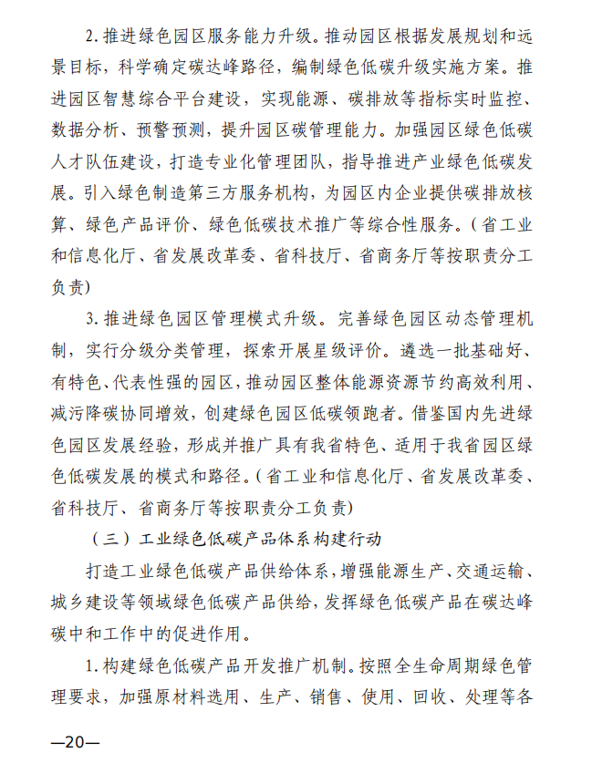 發(fā)揮綠色園區(qū)示范引領(lǐng)作用,聚焦園區(qū)能源資源利用、產(chǎn)業(yè) 發(fā)展、環(huán)境保護(hù)等,探索開(kāi)展綠色園區(qū)低碳升級(jí)示范建設(shè),帶動(dòng) 全省園區(qū)綠色低碳發(fā)展。 推進(jìn)綠色園區(qū)基礎(chǔ)設(shè)施低碳升級(jí)。加快園區(qū)能源基礎(chǔ)設(shè)施建設(shè),推進(jìn)“光伏上房”、綠色微電網(wǎng)、園區(qū)儲(chǔ)能等項(xiàng)目,鼓勵(lì)園區(qū)實(shí)施熱電聯(lián)產(chǎn)。