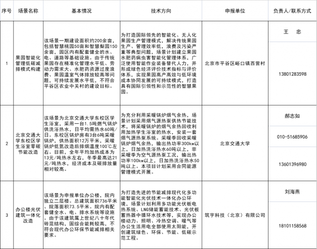 為推進(jìn)本市構(gòu)建市場導(dǎo)向的綠色技術(shù)創(chuàng)新體系工作,根據(jù)《北京市關(guān)于進(jìn)一步完善市場導(dǎo)向的綠色技術(shù)創(chuàng)新體系若干措施》(京發(fā)改〔2021〕1411號(hào),以下簡稱《若干措施》)、《北京市創(chuàng)新型綠色技術(shù)及示范應(yīng)用項(xiàng)目征集遴選管理細(xì)則》(京發(fā)改規(guī)〔2021〕9號(hào)),我們組織開展了創(chuàng)新型綠色技術(shù)應(yīng)用場景征集工作。經(jīng)公開征集、資料審核和現(xiàn)場調(diào)研,現(xiàn)發(fā)布第一批創(chuàng)新型綠色技術(shù)應(yīng)用場景。若有意愿在上述應(yīng)用場景開展技術(shù)應(yīng)用的單位,可與應(yīng)用場景負(fù)責(zé)人聯(lián)系,自行溝通協(xié)商后續(xù)合作工作。后期,我們將持續(xù)跟蹤應(yīng)用場景技術(shù)應(yīng)用情況,并按照《若干措施》要求,對(duì)符合條件的技術(shù)應(yīng)用效果第三方評(píng)價(jià)進(jìn)行支持。