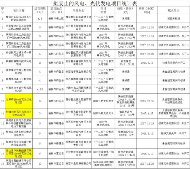 龍?jiān)锤?0兆瓦光伏電站項(xiàng)目廢止原因?yàn)椋簾o法落實(shí)建設(shè)條件、未按期建成投運(yùn);麻鎮(zhèn)30兆瓦生態(tài)光伏農(nóng)業(yè)電站項(xiàng)目廢止原因?yàn)闊o法落實(shí)建設(shè)條件、未按期建成投運(yùn);不具備建成投運(yùn);定邊縣華光新能源有限公司定邊50兆瓦光伏電站項(xiàng)目廢止原因:核準(zhǔn)文件延期失效、未開工。