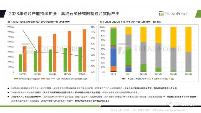 接下來是硅片的產(chǎn)能以及技術(shù)方向。2023年,硅片企業(yè)進入了新一輪的擴產(chǎn)周期,頭部企業(yè)為了保護自身規(guī)模優(yōu)勢,產(chǎn)能在持續(xù)擴張。新玩家以及二線企業(yè)也在持續(xù)的擴張產(chǎn)能,龍頭企業(yè)的產(chǎn)能集中度在持續(xù)的下滑,整體行業(yè)的競爭格局趨于分散。在硅片生產(chǎn)環(huán)節(jié)中需要用到的坩鍋材料、高純石英砂緊缺的態(tài)勢也是比較確定的,這也將對硅片的實際產(chǎn)出形成限制。但這也在一定程度上緩解了硅片競爭格局的惡化。大尺寸及薄片化也是比較確定的,2023年大尺寸市占比將突破90%,硅料的緊缺以及價格高企加速了各硅片企業(yè)薄片化的推動進程。此外,隨著下游電池片環(huán)節(jié)技術(shù)迭代的不斷加速,n型硅片的滲透率也將不斷提升,目前,n型硅片的總體產(chǎn)量還比較低,占比大約是在8%左右。隨著TOPCon電池片的量產(chǎn),預(yù)計2023年占比將提升至20%以上。