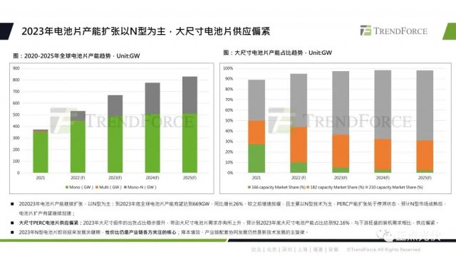TOPCon因為它的性價比優(yōu)勢,實現(xiàn)了率先放量。預(yù)計到2023年底,N型電池片的產(chǎn)能將達到180GW,占比約為25.7%。