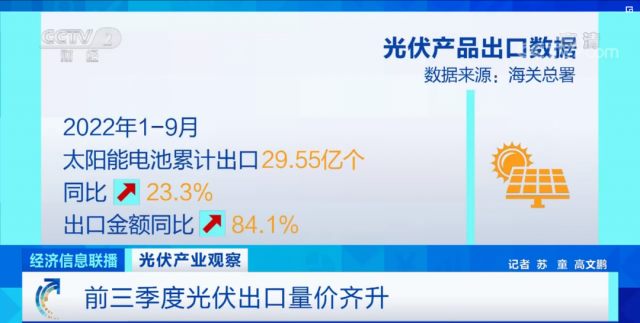 光伏產(chǎn)品的出口表現(xiàn)也超出預(yù)期,海關(guān)數(shù)據(jù)顯示,今年前9個月,太陽能電池累計出口29.55億個,同比增長23.3%,出口金額同比增加84.1%,實(shí)現(xiàn)量價齊升。