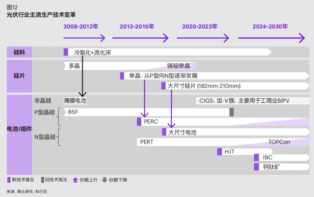 其一,單瓦組件成本長期將逐步下降,主要得益于技術演進帶來的轉換效率提升。電池組件主流技術正在快速演進迭 代( 如 圖 12),已 經 從 傳 統(tǒng) P 型 向 PERC+ 和 N 型TOPCon 及 HJT 發(fā)展,未來隨著新型技術的發(fā)展,如具備成本優(yōu)勢的鈣鈦礦在突破穩(wěn)定性瓶頸后、其疊層電池大幅提升太陽光利用水平,將有可能進一步大幅降低降低單位成本。同時,隨規(guī)模效應顯現,單位產線投資成本下降以及人均產出率提升將進一步拉低電池組件成本。