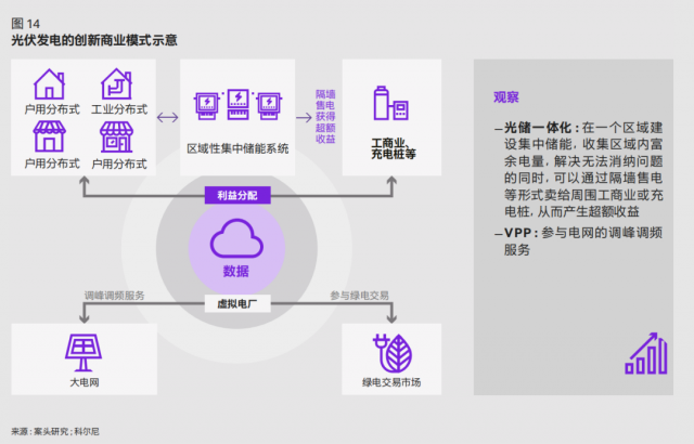 一邊是消納困局、一邊是電價短期波動風險,戶用光伏發(fā)電正經歷著來自市場的新考驗。結合光伏發(fā)電商業(yè)模式判斷,未來光儲一體化和虛擬電網兩種創(chuàng)新模式的發(fā)展或成為針對上述挑戰(zhàn)的最優(yōu)解法(如圖 14)。