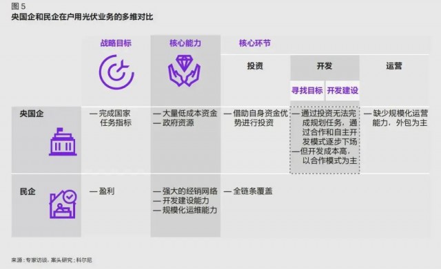 由于央國企和民營企業(yè)對于戶用光伏的戰(zhàn)略定位、切入賽道和自身能力均不同,因此其各自具備獨特的商業(yè)模式,且在產業(yè)鏈上逐漸形成互補合作的上下游關系(如圖 5)。
