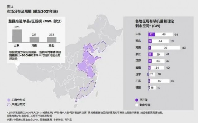 綜合考慮市場空間、綜合條件、產權模式等因素,科爾尼認為山東、河北、河南、浙江、江蘇、安徽、遼寧、廣東與福建為未來整縣推進領域的九大高潛力市場。其中,山東、河北、河南地區(qū)雖競爭激烈,但可開發(fā)空間仍十分可觀;浙江、江蘇由于居民投資意識強,整體出售市場更具吸引力;安徽、遼寧、廣東、福建綜合條件優(yōu)勢明顯,建議重點布局。根據測算,當前整縣推進的平均單體項目規(guī)模預計在300MW 左右(如圖 4)。