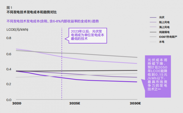 能源結構調整無疑是能源戰(zhàn)略中最重要的一環(huán)。在眾多新能源發(fā)展路線中,光伏是最優(yōu)質的選項之一,光伏發(fā)電技術成本優(yōu)勢突出??茽柲犷A測,到 2023 年后,光伏發(fā)電的平準化度電成本(LCOE)將在所有發(fā)電技術中達到最低,并預計在 2050 年進一步下降至 0.15 元 /kWh(如圖 1)。成本優(yōu)勢下,光伏有潛力成為未來中長期發(fā)展最快的細分賽道。