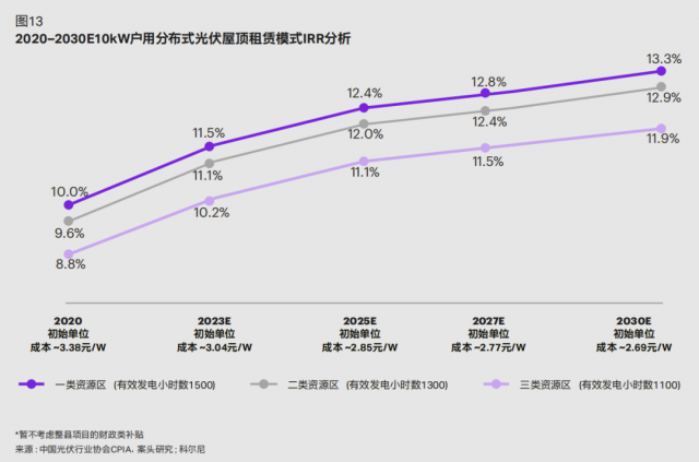 系統(tǒng)成本的大幅下降將大幅提升收益率。據科爾尼預測,在未來三類資源區(qū)的屋頂租賃模式 IRR 都將穩(wěn)步上升,并將 于 2030 年分別增至 13.3%、12.9% 和 11.9%(如圖13)。
