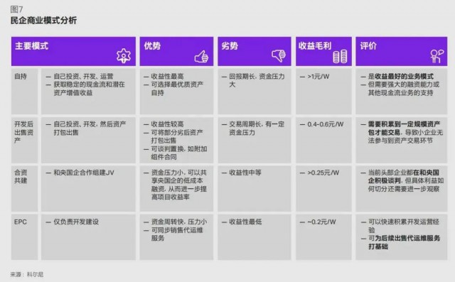 自持資產包是民企的主流業(yè)務模式。民企通過全程進行投資、開發(fā)與運營,獲取穩(wěn)定的現金流和潛在資產增值收益,是當前收益最好的模式,毛利可超過 1 元 /W。但由于對資金要求較高且回報周期長,通常需要強大的融資能力或其他現金流業(yè)務的支持。