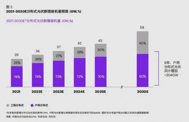 根據市場趨勢,科爾尼認為, 2025 年以前戶用光伏會在政策和盈利性提升驅動下大幅提速,后期隨著整縣推進結束,預期 2025-2030 增速會略有放緩。保守預計中國市場到 2030 年將累計增加戶用光伏超過 300GW,市場空間廣闊(如圖 3)。