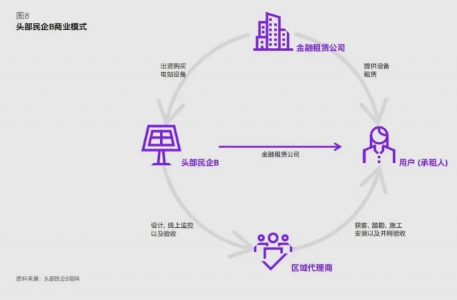 與民企 A 大量資產自持模式不同,民企 B 打造了一條輕資產模式(如圖 8):引入金融租賃公司授信托底,自己則作為開發(fā)方賺取差價,同時提供帶運維服務以獲得持續(xù)的管理費收入。民企B的核心優(yōu)勢在于其家電業(yè)務所積累的廣泛渠道資源,與此同時,通過大幅度讓利經銷商并提供更快付款節(jié)奏,公司在前期搶占了部分市場資源。
