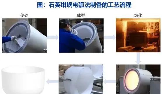 電弧法是制備石英坩堝的主流制備技術(shù)。將高純的石英砂原料倒入坩堝模具內(nèi),通過成型裝置將石英砂原料均勻的成型在模具的內(nèi)表面以成型坩堝坯,然后將坩堝模具整體移入電弧熔制爐內(nèi),通過石墨電極釋放高溫電弧使石英砂熔化,最后快速冷卻形成石英坩堝毛坯。石英坩堝分為內(nèi)層透明層、中層氣泡復(fù)合層和外層薄氣泡層,各層質(zhì)量占比分別為25%-70%、20%-40%和5%-30%,通常比例為4:3:4或者3:4:3。