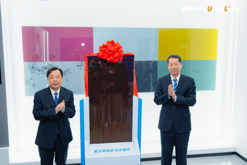 方書記一行還參觀了極電光能鈣鈦礦科技展廳和150MW鈣鈦礦生產(chǎn)線,現(xiàn)場(chǎng)為首片下線的鈣鈦礦光伏組件揭幕。