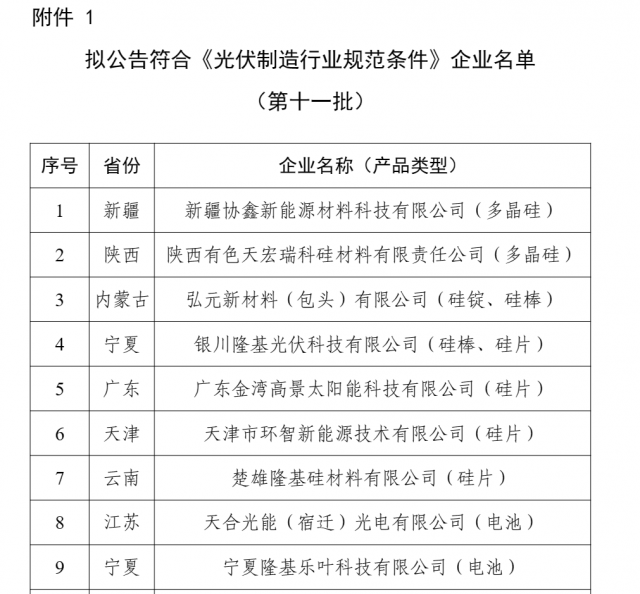 1.擬公告符合《光伏制造行業(yè)規(guī)范條件》企業(yè)名單(第十一批)