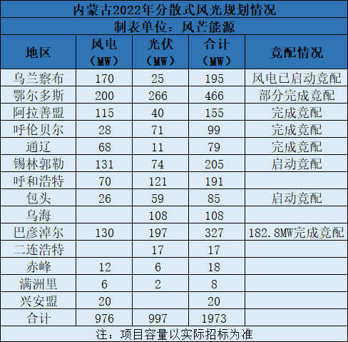 2021年6月,內(nèi)蒙古印發(fā)《內(nèi)蒙古自治區(qū)分散式風(fēng)電、分布式光伏發(fā)電項目三年行動計劃(2021~2023年)》顯示,2022年內(nèi)蒙古規(guī)劃分散式風(fēng)光容量為1.973GW,其中風(fēng)電976MW,光伏997MW。