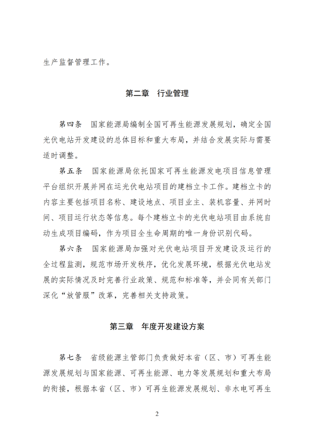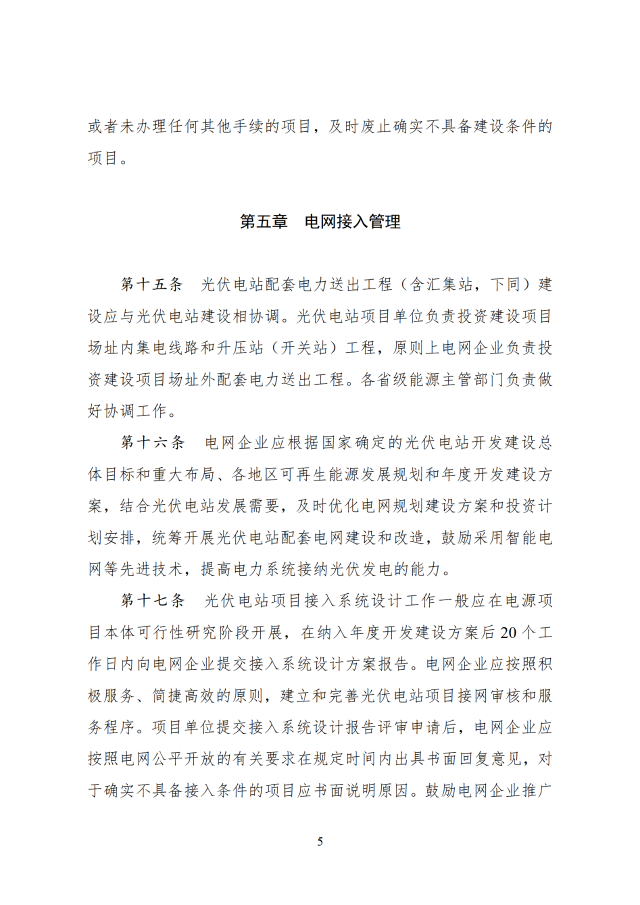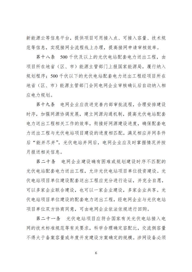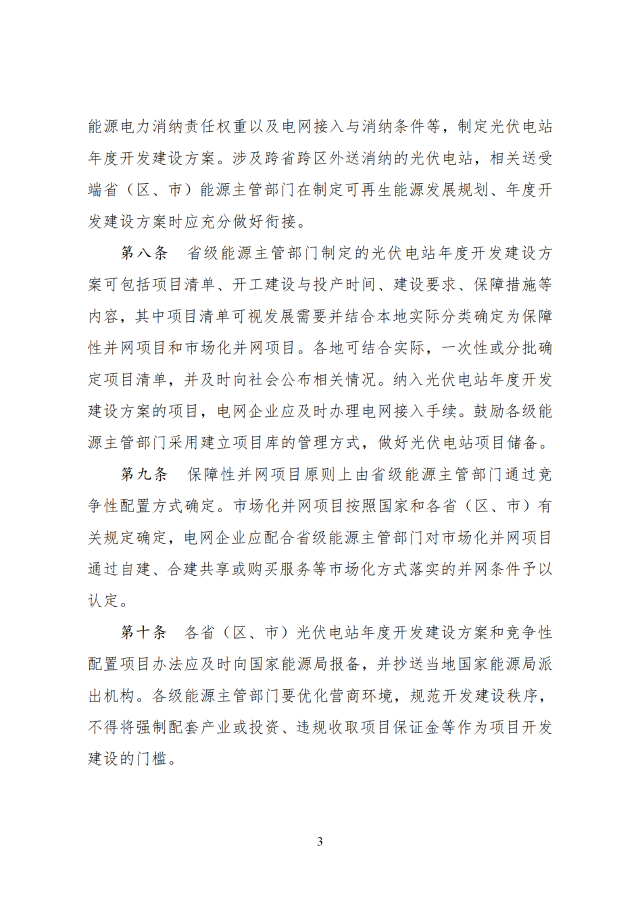 省級能源主管部門負責做好本省(區(qū)、市)可再生能源發(fā)展規(guī)劃與國家能源、可再生能源、電力等發(fā)展規(guī)劃和重大布局的銜接,根據本省(區(qū)、市)可再生能源發(fā)展規(guī)劃、非水電可再生能源電力消納責任權重以及電網接入與消納條件等,制定光伏電站年度開發(fā)建設方案。涉及跨省跨區(qū)外送消納的光伏電站,相關送受端省(區(qū)、市)能源主管部門在制定可再生能源發(fā)展規(guī)劃、年度開發(fā)建設方案時應充分做好銜接。