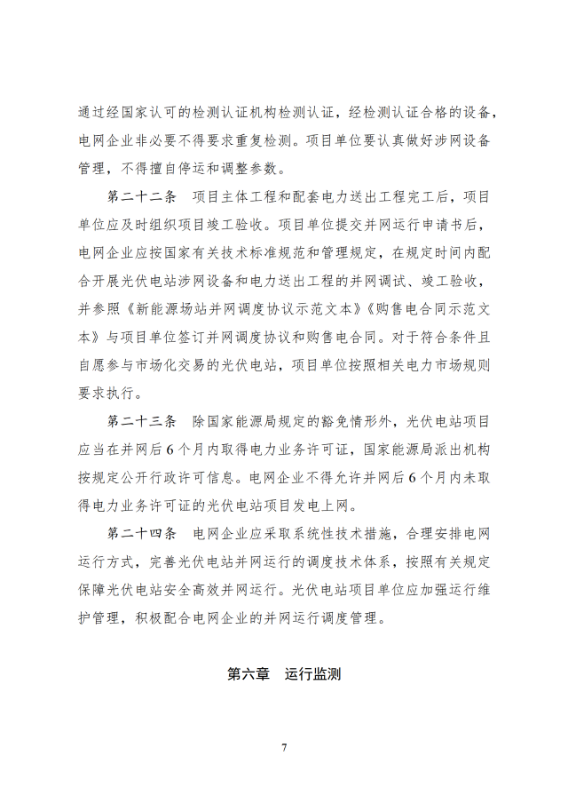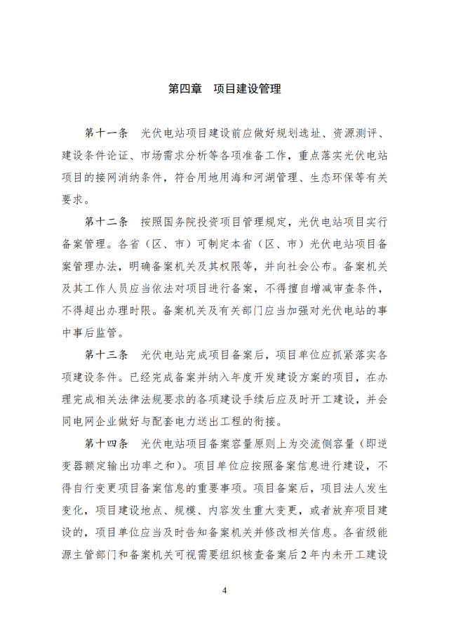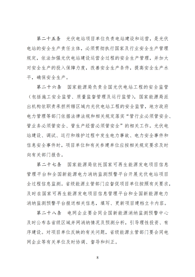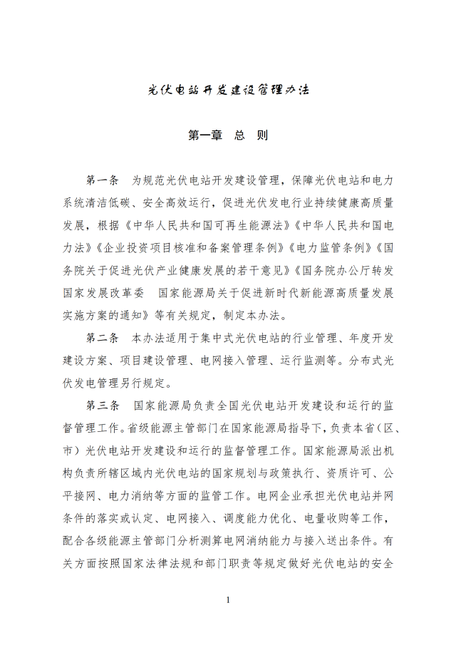 12月26日,國家能源局印發(fā)關于《光伏電站開發(fā)建設管理辦法》的通知,通知提到,國家能源局負責全國光伏電站開發(fā)建設和運行的監(jiān)督管理工作,電網企業(yè)承擔光伏電站并網條件的落實或認定、電網接入、調度能力優(yōu)化、電量收購等工作,配合各級能源主管部門分析測算電網消納能力與接入送出條件。有關方面按照國家法律法規(guī)和部門職責等規(guī)定做好光伏電站的安全生產監(jiān)督管理工作。