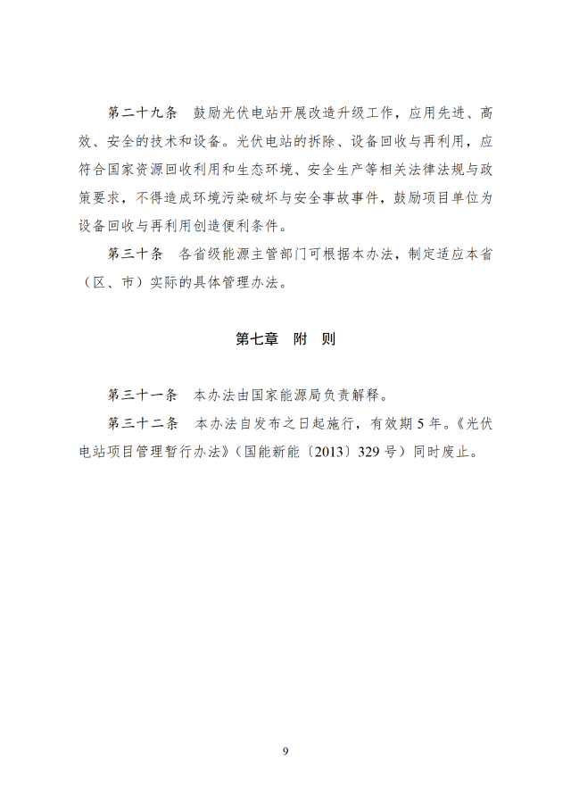 鼓勵光伏電站開展改造升級工作,應用先進、高效、安全的技術和設備。光伏電站的拆除、設備回收與再利用,應符合國家資源回收利用和生態(tài)環(huán)境、安全生產等相關法律法規(guī)與政策要求,不得造成環(huán)境污染破壞與安全事故事件,鼓勵項目單位為設備回收與再利用創(chuàng)造便利條件。