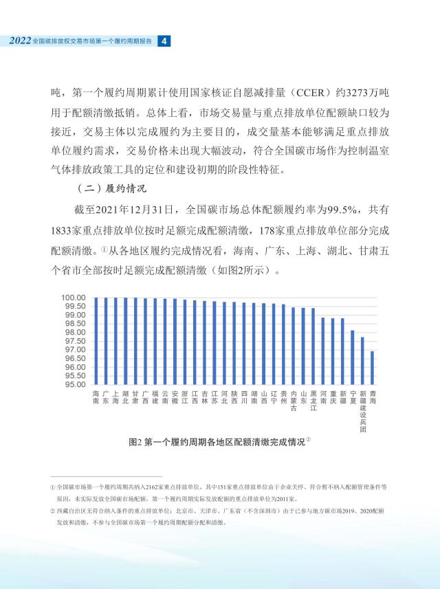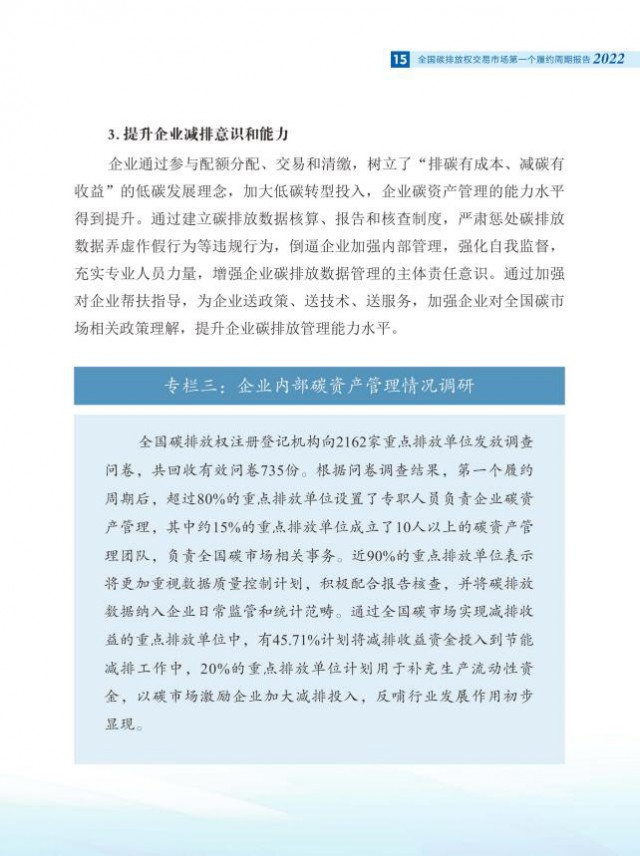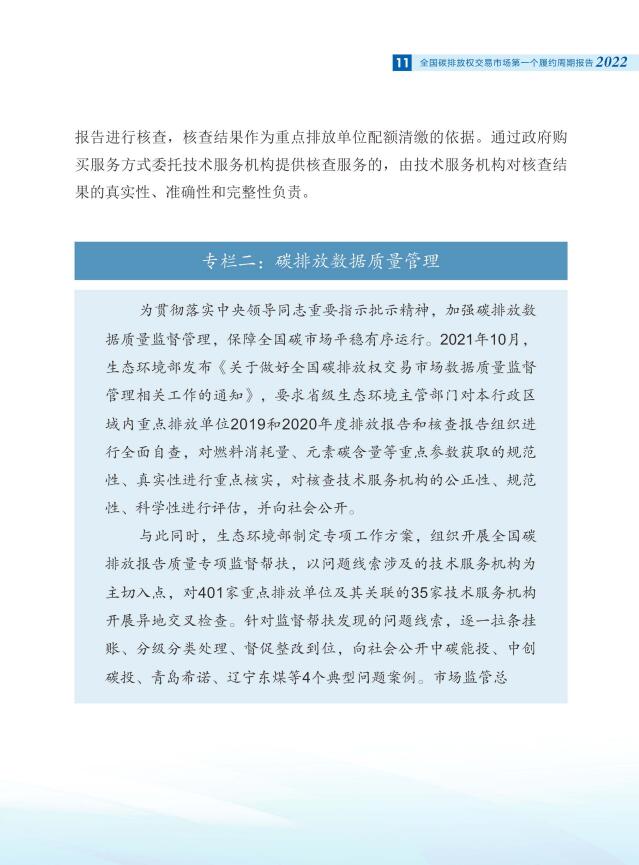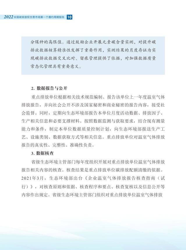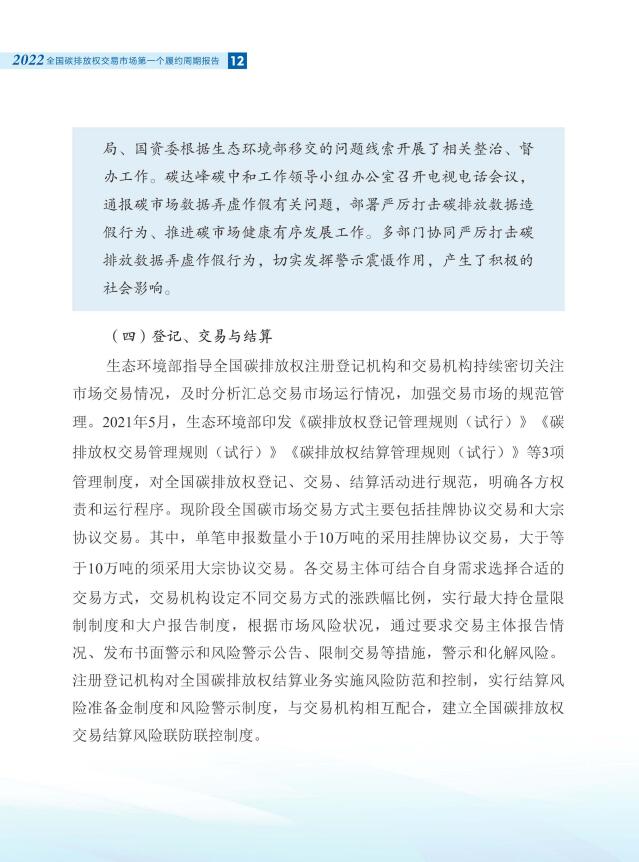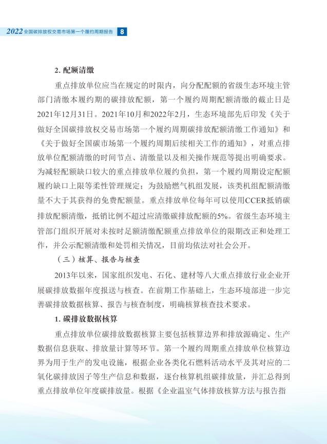 報(bào)告全面介紹了全國碳市場第一個(gè)履約周期市場交易和履約情況,對配額分配和清繳的工作考慮做了說明,總結(jié)梳理了碳排放核算、報(bào)告與核查制度體系建設(shè)進(jìn)展,對加強(qiáng)重點(diǎn)排放單位數(shù)據(jù)質(zhì)量管理相關(guān)舉措做了介紹。