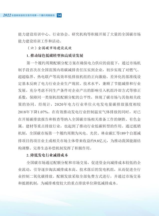 總體來看,經(jīng)過第一個(gè)履約周期建設(shè)運(yùn)行,全國碳市場運(yùn)行框架基本建立,初步打通了各關(guān)鍵環(huán)節(jié)間的堵點(diǎn)、難點(diǎn),價(jià)格發(fā)現(xiàn)機(jī)制作用初步顯現(xiàn),企業(yè)減排意識和能力水平得到有效提高,通過專項(xiàng)監(jiān)督幫扶等措施有效提升碳排放數(shù)據(jù)質(zhì)量,實(shí)現(xiàn)了預(yù)期建設(shè)目標(biāo)。全國碳市場建設(shè)運(yùn)行對促進(jìn)全社會低成本減排發(fā)揮了積極作用。
