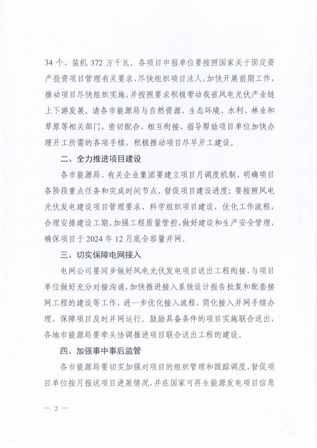 支持新能源產(chǎn)業(yè)發(fā)展項目34個,裝機(jī)372萬千瓦(3.72GW)。其中,光伏項目16個,風(fēng)光一體項目1個(含光伏6萬千瓦),涉及光伏項目共197萬千瓦(1.97GW)。要求確保項目于2024年12月底全容量并網(wǎng)。