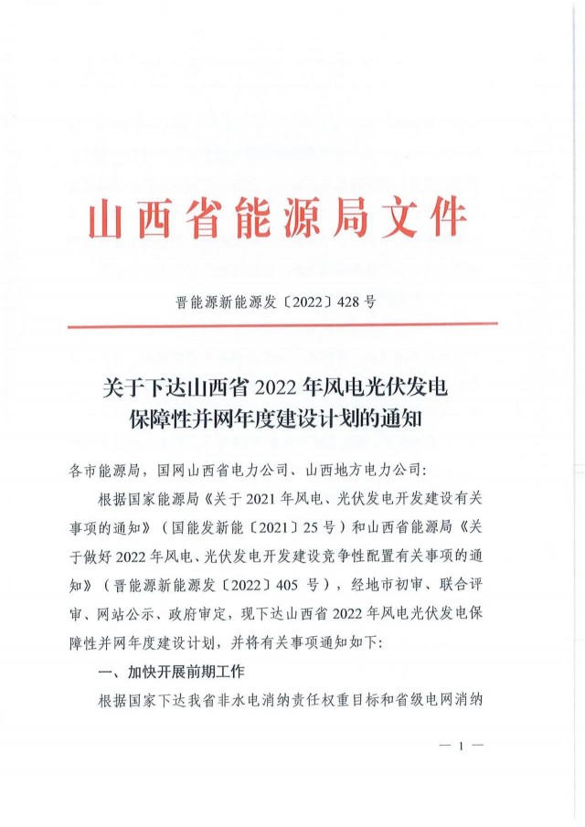 近日,山西省能源局先后印發(fā)了《關(guān)于下達(dá)山西省2022年風(fēng)電光伏發(fā)電保障性并網(wǎng)年度建設(shè)計劃的通知》(晉能源新能源發(fā)〔2022〕428號)和《關(guān)于下達(dá)山西省2022年支持新能源產(chǎn)業(yè)發(fā)展風(fēng)電光伏發(fā)電建設(shè)計劃的通知》(晉能源新能源發(fā)〔2022〕429號),共下達(dá)風(fēng)電、光伏項目132個,規(guī)模合計1418萬千瓦(14.18GW)。