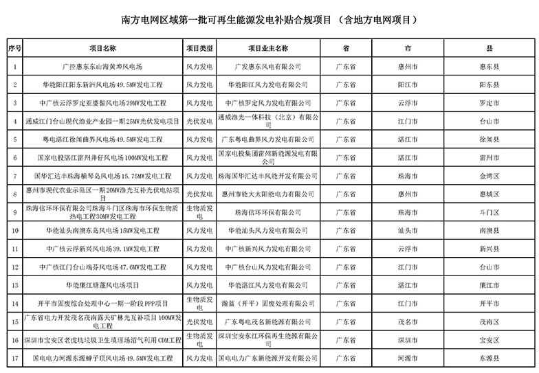 南方電網(wǎng)關(guān)于公布第一批可再生能源發(fā)電補貼合規(guī)項目清單的公告