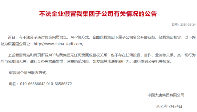2月24日,大唐集團公告稱,有不法分子通過偽造網(wǎng)頁網(wǎng)址、APP等方式,企圖以大唐集團下屬子公司名義開展業(yè)務。以下為公告原文: