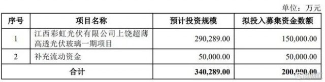 根據(jù)最新招股書(上會稿),本次發(fā)行上市,公司擬募資20億元,其中15億元用于投入“江西彩虹光伏有限公司上饒超薄高透光伏玻璃一期項目”、5億元用于“補充流動資金”。