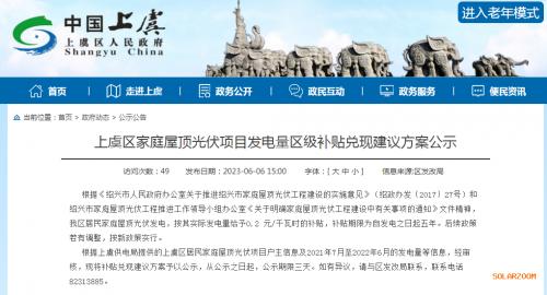 文件明確,根據(jù)《紹興市人民政府辦公室關(guān)于推進紹興市家庭屋頂光伏工程建設(shè)的實施意見》(紹政辦發(fā)〔2017〕27號)和紹興市家庭屋頂光伏工程推進工作領(lǐng)導(dǎo)小組辦公室《關(guān)于明確家庭屋頂光伏工程建設(shè)中有關(guān)事項的通知》文件精神,上虞區(qū)居民家庭屋頂光伏發(fā)電,按其實際發(fā)電量給予0.2元/千瓦時的補貼,補貼期限為自發(fā)電之日起五年。后續(xù)政策若有調(diào)整,按新政策實行。