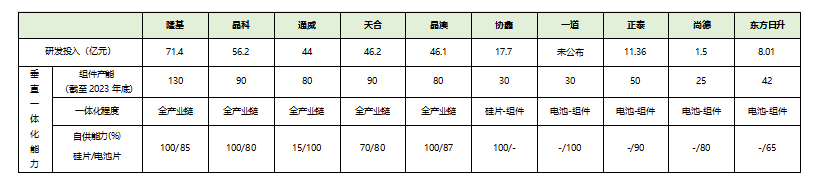 長(zhǎng)期高強(qiáng)度的研發(fā)投入是科研實(shí)力長(zhǎng)期引領(lǐng)的良性循環(huán)指標(biāo)。據(jù)上半年中標(biāo)規(guī)模TOP10企業(yè)2022年年報(bào)數(shù)據(jù)所示,企業(yè)年研發(fā)投入占營(yíng)收的比例均約為5.44%,而排名TOP5的企業(yè)已與第二梯隊(duì)形成代際差。由于龍頭企業(yè)具備成本優(yōu)勢(shì)、資源優(yōu)勢(shì)和整合優(yōu)勢(shì),相較于行業(yè)內(nèi)其它企業(yè)更具競(jìng)爭(zhēng)力。對(duì)于技術(shù)研發(fā)和擴(kuò)產(chǎn)的強(qiáng)勢(shì)布局,是龍頭企業(yè)戰(zhàn)略性的判斷和對(duì)技術(shù)領(lǐng)先的自信,亦是龍頭企業(yè)未來(lái)應(yīng)對(duì)產(chǎn)業(yè)爆發(fā)的交付儲(chǔ)備,垂直一體化自供能力達(dá)到80%的企業(yè)則具有更好的交付保障能力。
