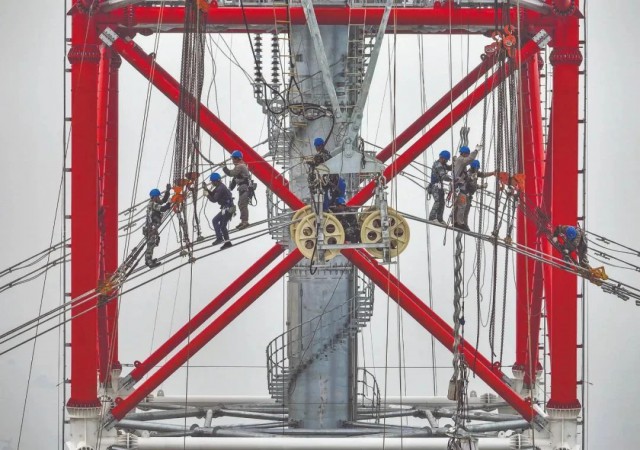 近日,國內(nèi)規(guī)模最大的超高壓跨越長江輸變電工程——泰州鳳城至無錫梅里500千伏輸變電工程正式建成投運(yùn),圖為作業(yè)人員進(jìn)行高空導(dǎo)線施放作業(yè)