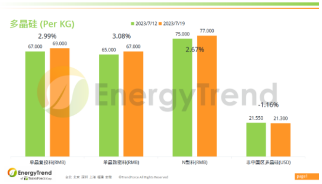 根據(jù)集邦咨詢旗下新能源研究中心集邦新能源網(wǎng)(EnergyTrend)2023年7月19日的報(bào)價(jià),單晶復(fù)投料人民幣價(jià)格為 RMB69/KG,增幅為 2.99%;單晶致密料人民幣最新價(jià)格為 RMB67/KG,較上周增長了 3.08%。N型料人民幣報(bào)價(jià)從 RMB75/KG 增長至 RMB77/KG,漲幅為 2.67%。非中國區(qū)多晶硅料美金價(jià)格為 US$21.3/KG。
