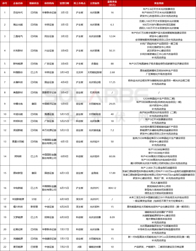 索比光伏網(wǎng)據(jù)公開數(shù)據(jù)統(tǒng)計(jì),今年以來IPO獲得受理的光伏公司共有22家,包括3家太陽能電池企業(yè),光伏膠膜、光伏玻璃、逆變器、EPC企業(yè)各2家,還有多晶硅、光伏漿料、石英坩堝、接線盒等環(huán)節(jié)企業(yè),擬募資額合計(jì)超1285億元,其中華電新能以804.12億元的募資額創(chuàng)下目前A股新能源領(lǐng)域的最大規(guī)模IPO記錄。