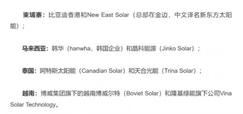 結(jié)果發(fā)現(xiàn)有5家公司試圖規(guī)避關(guān)稅,它們分別是:比亞迪、隆基綠能、阿特斯太陽(yáng)能、天合光能和新東方太陽(yáng)能,其業(yè)務(wù)部門都被認(rèn)定違反了反傾銷和反補(bǔ)貼稅法律,必須支付高額關(guān)稅。而主要的組件供應(yīng)商韓華、晶科、博維等沒有違反法律。